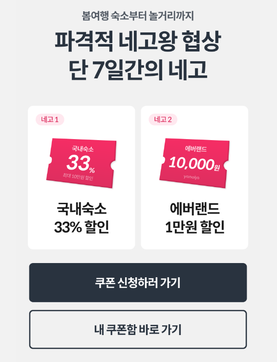 1. 국내 숙소 33% 할인 쿠폰 지급 *총 7일간 5만 500명 추첨(발표는 쿠폰 신청일 다음날 10시) *최대 할인 금액 10만 원 *사용 기간 : 쿠폰 발급 후 3일 *투숙 기간 : 쿠폰 발급일 포함 90일 까지