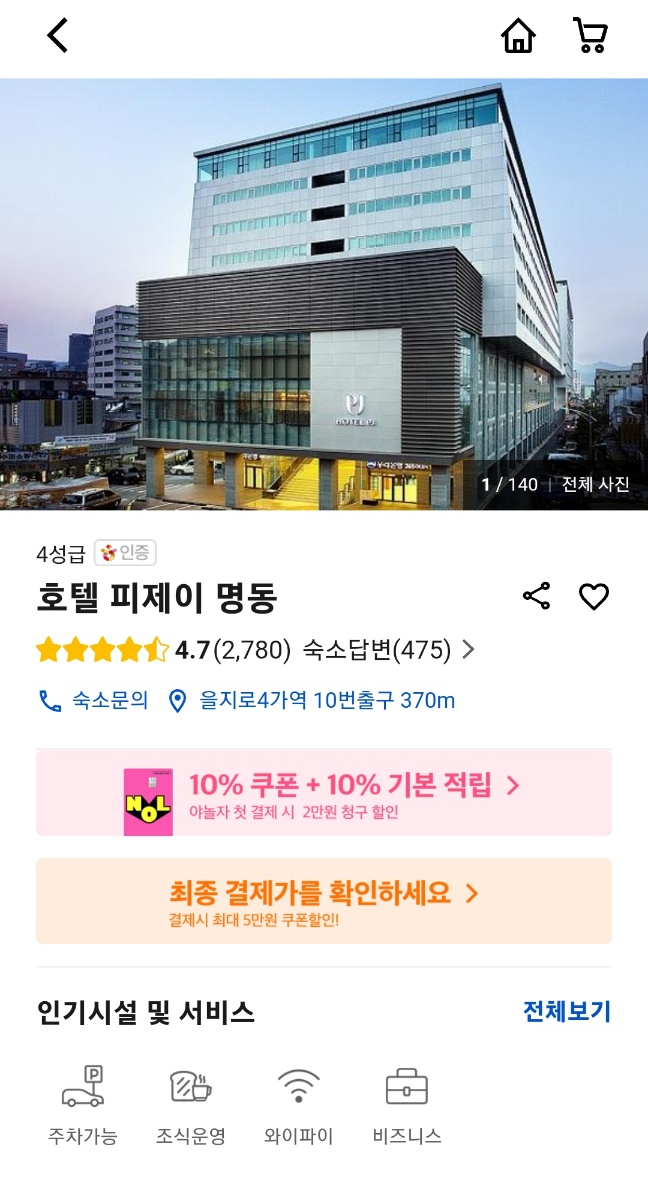 호텔 피제이 명동 4성급이에요. 4성급은 비쌀 줄 알았는데 기본 가격도 생각보다 그렇게 비싼 가격은 아니었습니다. 위치도 나름 역세권에 위치했기 때문에 주변에 돌아니고 먹을 곳이 꽤 많을 것 같다는 생각이 들었습니다.